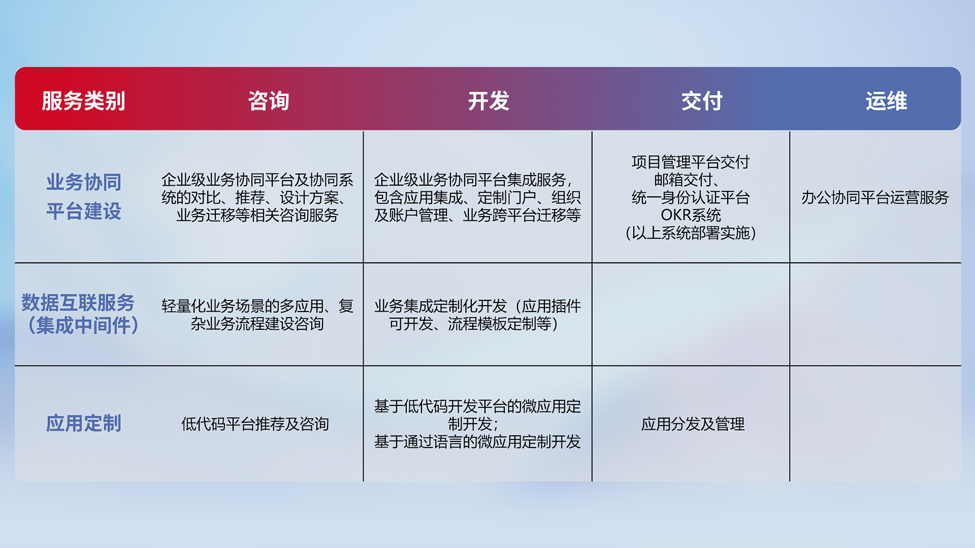 基于全代码低代码的数字化应用系统开发及交付,,,满足特定业务场景的应用开发及集成,,,提升企业业务信息化及数字化能力。。